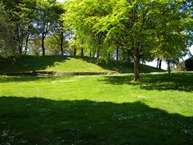 Medieval motte and bailey castle, damaged by landscape gardening. The truncated motte is 52 feet high above the ditch and the bailey is surrounded by a bank 6 feet in height. The ditch surrounding the motte and bailey is 50 feet wide. Although mutilated most of these features were present during field investigation in 1965 and are visible as earthworks on air photographs. (PastScape)