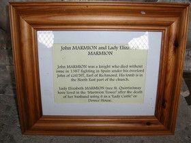 Marmion Tower is situated in the village of West Tanfield, next to the parish church and on the north bank of the River Ure. The tower is the fifteenth century gatehouse of the now demolished Tanfield Castle. The monument, at this time, comprises the tower and the ground beneath it only, as the precise location of the castle, which was a fortified manor house of the Marmion family, has not yet been located. The tower is a three storey building, roughly square in plan, with a projection at the north-west corner containing a newel stair. The gateway is barrel vaulted and has a guardroom to the south. The stair leads to the rooms above and ends in a turret above the battlements of the gatehouse. The tower is a Grade I Listed Building and has been in State care since 1927. (Scheduling Report)