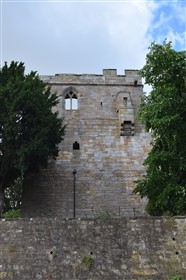 Gatehouse/castle. C14, C16. Ashlar. 3 storeys, 1 bay. Square in plan. East front: large chamfered 4-centred archway with hoodmould to right. To its left a small chamfered rectangular opening. First floor: a central oriel canted window with 2-light cusped openings with Perpendicular tracery to each face, hipped roof above. Second floor: a central moulded mullion and transom window with hoodmould. Moulded eaves band. Embattled parapet. South front: first floor has a small square opening to left, to its right a pointed-arched cusped 1-light window. Second floor: to left a 2-light cusped Y-tracery pointed-arched window with hoodmould. To right a corbelled garderobe. Eaves band has 2 rain spouts. West front: similar arch as to east side. First floor has a moulded mullion and transom window with hoodmould. Second floor: central 2-light cusped Y-tracery pointed-arched window with hoodmould and transom. Clasping north-west corner, a 4-stage stair tower with small chamfered 1-light rectangular openings. It rises above the embattled parapet with its own eaves band and embattled parapet. North front, blind except for chamfered single-light window to second floor